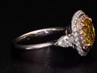Introducing our elegant Fancy Vivid Yellow Ring, a timeless blend of sophistication and opulence. At its heart, a 2.05-carat cushion-cut Fancy Vivid Yellow diamond, GIA-certified, radiates unmatched brilliance. The ring is set in 18K rose and white gold, weighing 6.0 grams, and designed with a double halo of fancy pink and white diamonds. The shank is accompanied by two pear-shaped diamonds, further enhancing its beauty and sophistication. Embrace the allure of this exceptional piece and indulge in the captivating elegance of this diamond—an exquisite testament to your refined taste.